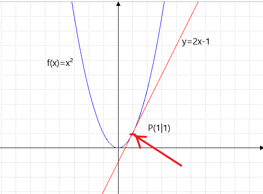 An der Stelle (1|1) ist eine Tangente gezeichnet mit der Steigung 2.